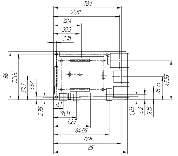 - На плате присутствуют 3 монтажных отверстия M2.5 (на расстоянии 3,5 мм от края).