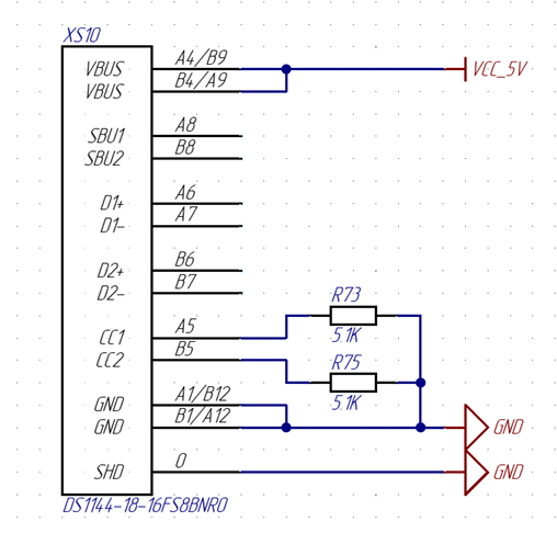 USB type-C (POWER). Питание платы ELTAY BB CM4 осуществляется через разъем USB type-C. Максимальная потребляемая мощность 15 Вт. Разъем так же может быть использован для питания внешних устройств при условии, что питание платы осуществляется через разъем XP10 (2-pin POWER), а потребляемый ток не превышает 1А. Подключение разъема USB type-C:
