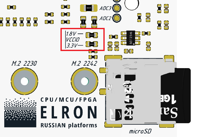 Уровень сигнала может быть выбран произвольно - 3.3 В или 1.8 В. Необходимый уровень питания задается резисторами. Для установки напряжения 3.3 В необходимо впаять резистор, обозначенный на плате как 3.3V. Для установки напряжения 1.8 В необходимо впаять резистор, обозначенный на плате как 1.8V. Таким образом, будет подано необходимое питание на контакт VCCIO6, который физически соединен с доменом питания этой группы выводов.